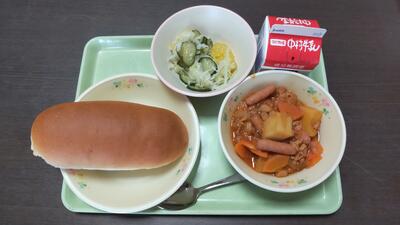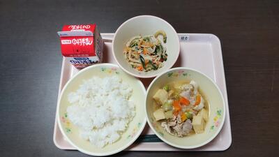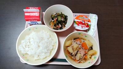 今日のメニュー【ご飯、牛乳、じゃが豚キムチ、土佐酢あえ、アセロラゼリー】