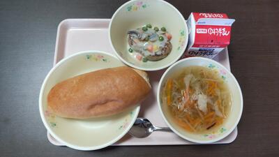 今日のメニュー【ミニコッペパン、牛乳、チャンポン、鶏とレンコンのサラダ、マーシャルビンズ】