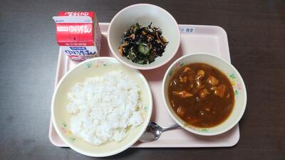 今日のメニュー【牛乳、ご飯、チキンカレー、ひじきのサラダ】