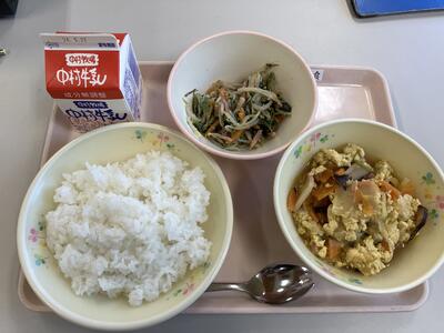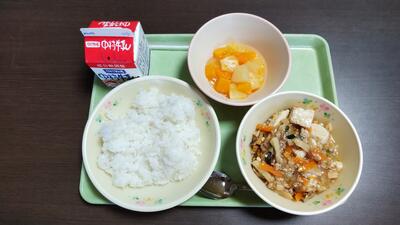 今日のメニュー【牛乳、ご飯、マーボ豆腐、フルーツゼリーあえ】