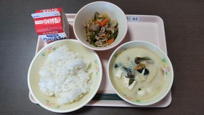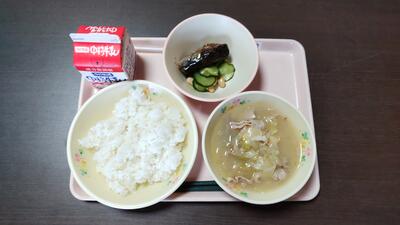今日のメニュー【ご飯、牛乳、豚肉とキャベツの味噌汁、イワシの梅煮、キュウリと大豆の和え物】