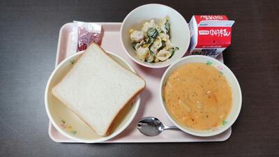 今日のメニュー【食パン、牛乳、人参ポタージュ、マカロニサラダ、いちごジャム】