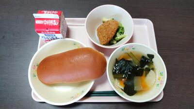 今日のメニュー【黒糖パン、牛乳、ラビオリスープ、かぼちゃひき肉フライ、ゆでブロッコリー】