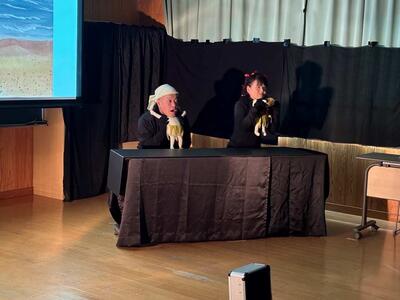 紙芝居のストーリーも紙芝居の絵も手づくりです。10名近くの方が関わってナレーターや照明、音楽などをすべて行い、「ありがとう星人」という紙芝居を行っていただきました。何回もリハーサルを行っていただいており、学校にも設置の準備や確認をしていただき、本番ではすべてがスムーズに進みました。
