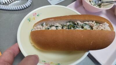 ツナサンドの具をパンにはさんで食べるととってもおいしいです。コーンスープとの相性も抜群です。