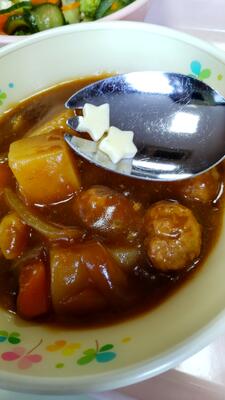 チーズが星形になっています。そしてカレーにはミートボールが入っています。じゃがいももしっかりと火が入っていて、甘口カレーが最高においしいです。子どもたちもモリモリ食べること間違いなしです。