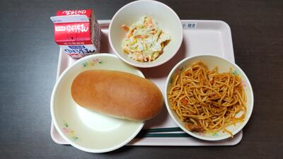 今日のメニュー【コッペパン、牛乳、ビーフン炒め、花野菜サラダ、ブルーベリーゼリー】