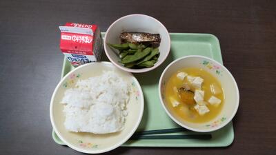 今日のメニュー【ご飯、牛乳、豚肉とキャベツの味噌汁、イワシの梅煮、キュウリと大豆の和え物】