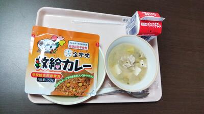 今日のメニュー【ミルクパン、牛乳、カレーうどん、青じそドレッシングのサラダ】