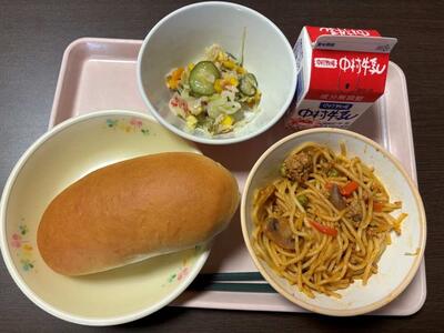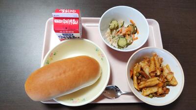 今日のメニュー【ミニミルクパン、牛乳、スパゲッティーミートソース、ピーマンサラダ】