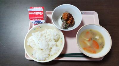 今日の給食【ごはん、牛乳、さつま汁、ホキの天玉揚げ 昆布和え】