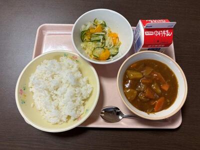 今日のメニュー【ご飯、牛乳、ミートボールカレー、チーズサラダ】