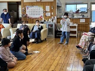 子どもたちがケアホームを訪問して行いたかったのはリンディックの演奏を聴いてもらうことと、クイズなどを通しての交流のようでした。