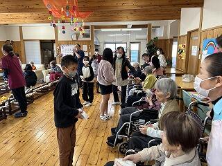 その際、利用者の皆さんとお話をしてほしいとのお願いがあり、子どもたちは笑顔で皆さんと話をしていました。