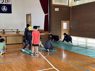 【男子は体育館のフロアにシートを敷きます】