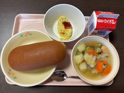 今日のメニュー【黒糖パン、牛乳、ポトフ、ほうれん草オムレツ】