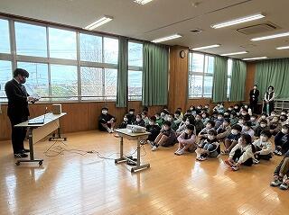 代表児童が2学期をふり返った作文を発表し、係の先生方から冬休みの過ごし方について話がありました。
