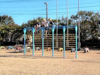 【「ここはビップ席です!!」と言い、遊具の上から応援する子どもたち】