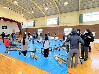 成澤様や地域の方々の支援を受け、約1時間作業を行い、少しずつ楽器の形が見えてきました。
