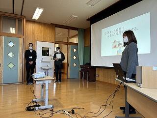 佐呂間小の発表の後、本校の子ども達(3年生)もグループごとに発表し、寺迫奴踊や都農ワイナリーの紹介などをしました。
