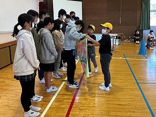 【しっぽ取りゲームの説明をする運営委員会の児童と5年生】
