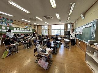 4年生は、2~3時間目に実施した竹の楽器作りを分校の4年生にも参加してもらいました。4時間目は、3名の大学生の皆さんとの交流を楽しんでいました。