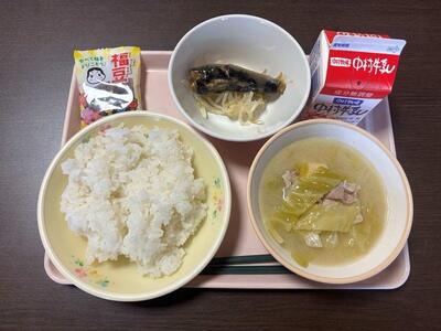 今日のメニュー【ごはん、牛乳、ゆでもやし、いわしの梅みそ煮、豚肉とキャベツの味噌汁、節分豆】