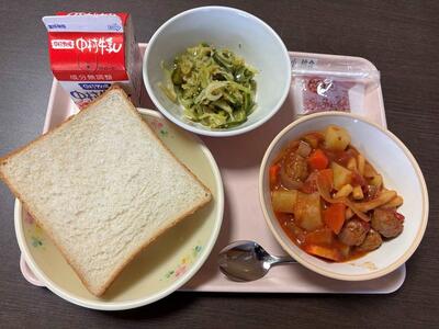 今日のメニュー【食パン、牛乳、肉団子のトマト煮、グリーンサラダ、イチゴジャム】
