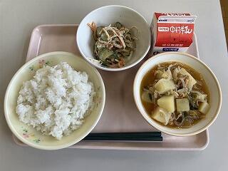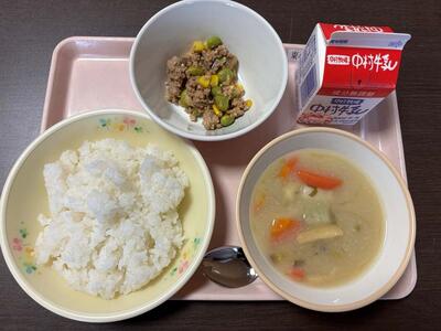 今日のメニュー【ごはん、牛乳、いもんこ汁、そぼろ丼】
