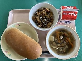 今日のメニュー【黒糖パン、牛乳、もずくスープ、大豆とかえりの揚げ煮】
