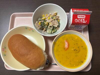 今日のメニュー【コッペパン、牛乳、かぼちゃのシチュー、ツナとレンコンのサラダ】