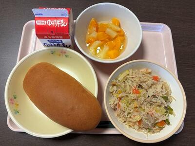 今日のメニュー【ミニミルクパン、牛乳、ビーフン炒め、フルーツゼリー和え】