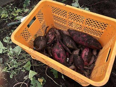 子どもたちの顔の大きさと同じぐらいの大きいお芋が収穫できました。大きくてなかなかぬけず「うんとこしょ、どっこいしょ」と掛け声をかけながら力を合わせてぬいたところです。力いっぱい引っ張りすぎてしりもちをついている子どももいました。笑顔が絶えない楽しい収穫の時間となりました。