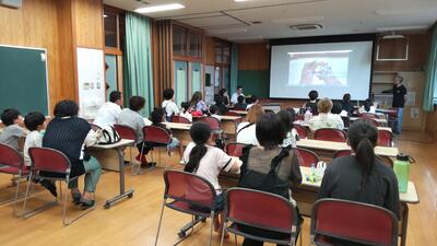 そのあと、防災士ネットワークの専門の方に、地震や津波などの危険性や避難の仕方などを話していただきました。動画も入った緊迫感のある内容で、子供たちも真剣に話を聞いていました。