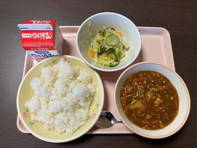 今日のメニュー【ごはん、牛乳、ひき肉と豆のカレー、みかんのサラダ】