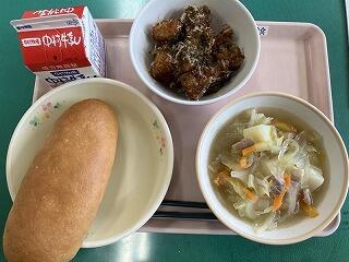 今日のメニュー【揚げパン、牛乳、肉団子スープ、フルーツゼリー和え】