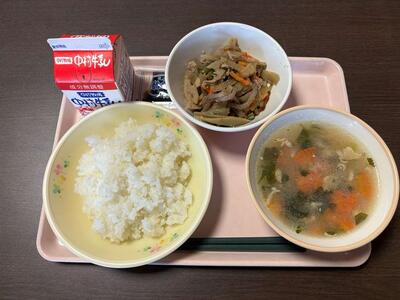 今日のメニュー【ごはん、牛乳、みぞれ汁、五目きんぴら、給食のり】