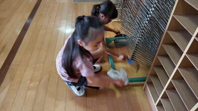 掃除の時間に、2年生が図工の絵を置く道具の下を拭いていました。