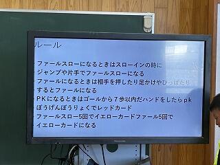 校内でサッカートーナメント戦を企画し、ルール説明やチーム発表をしています。