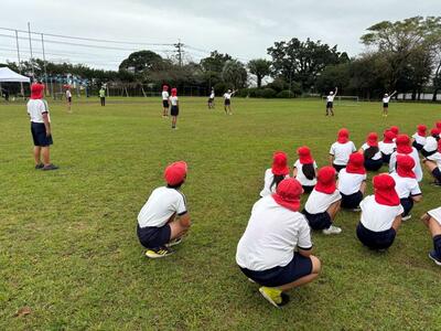開会式の流れをスタートに、運動会の歌の練習、エール交換、全校リレーの入退場(少しぬかるんでいたので、早歩きでバトンパスを練習)、応援などの確認をしました。