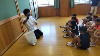 東京の大学から教授(図工やモノづくりにかかわる専門の先生)とイツノマさんをお招きし、わくわく教室を開催しました。中国にしかないゴム紐のようなものをご持参いただき、それを伸ばして様々な形を表現しました。体育館や家庭科室、廊下など様々な場所でゴム紐を伸ばし、ワイワイと楽しくモノづくりをしました。休み時間にはほかの学年も興味津々、廊下のひもをくぐって遊びました。