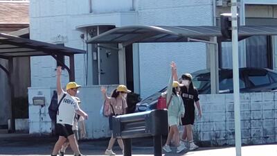 登校時の様子です。手を挙げて、右を見て、左を見て、右を見て安全を確認してから渡ります。右手をしっかりと挙げて、車を運転している方にお知らせをしています。大切な命を自分たちでしっかりと守ります。