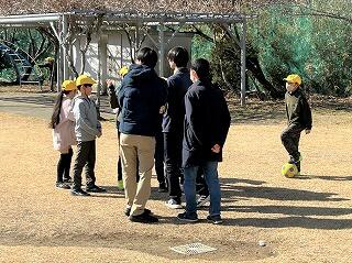 給食が終わり、大学へ戻るはずの皆さんでしたが、急きょ、昼休みに本校の子どもたちと一緒に遊んでくださることになりました。