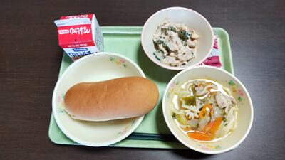 今日のメニュー【ミニコッペパン、牛乳、チャンポン、鶏とレンコンのサラダ、マーシャルビンズ】