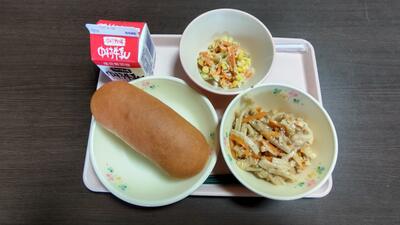 今日のメニュー【減量コッペパン、牛乳、ジャージャー麺、春色サラダ】