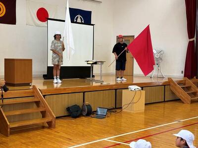 団の色が決定しました。団長がドキドキしながら封筒を開けると赤と白の色のついた紙が入っていました。団ごとに団長やリーダーからのあいさつがあり、優勝目指して一致団結していきましょうと誓いあいました。どちらも頼りになる団長とリーダーです。