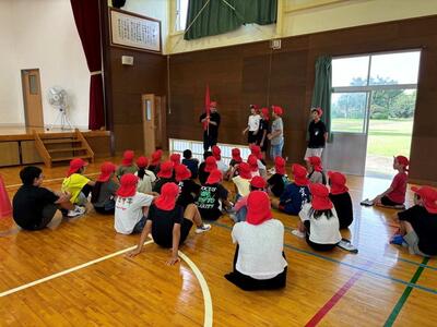 高学年の創作ダンスの練習風景です。現在、高学年では寺迫奴踊りとともに創作ダンスを練習中で、この写真は創作ダンスの様子です。全員で通して練習する中で、いい動きの例とそうでない動きの例を比較しながら、どこがどのようにいいのかを自分たちで考えながら取り組んでいます。
