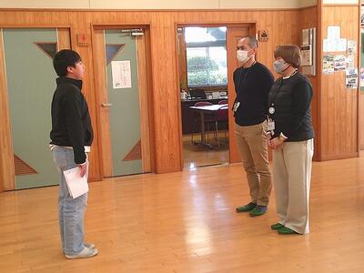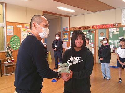 都農町社会福祉協議会から2名の方が来られ、生徒玄関前で贈呈式を行いました。