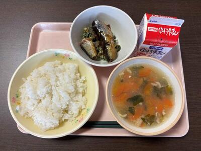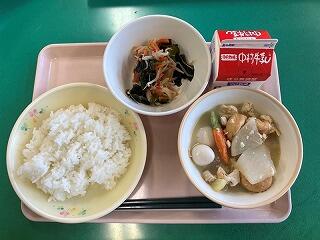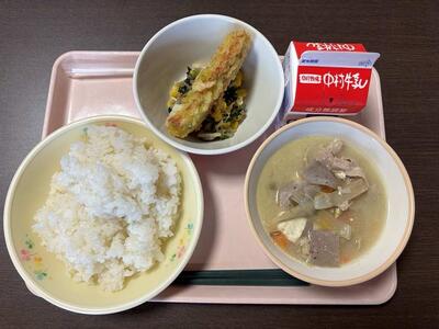 今日のメニュー【ごはん、牛乳、豚汁、ちくわの磯部揚げ、ごま和え】