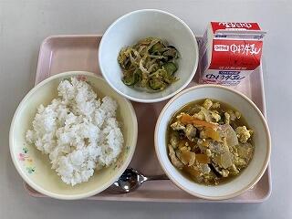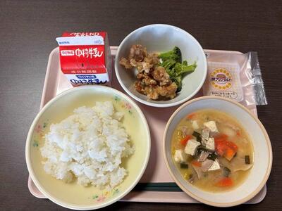 今日のメニュー【減量ご飯、牛乳、キムチ汁、から揚げ、ゆでブロッコリー、焼きプリンタルト】
